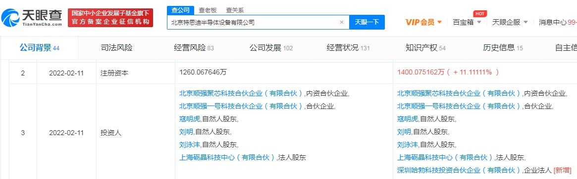 智通财经APP获悉,天眼查APP显示,北京特思迪半导体设备有限公司(下称:特思迪半导体)发生工商变更,新增华为旗下深圳哈勃科技投资合伙企业(有限合伙)为股东,注册资本由1260万元增至1400万元。