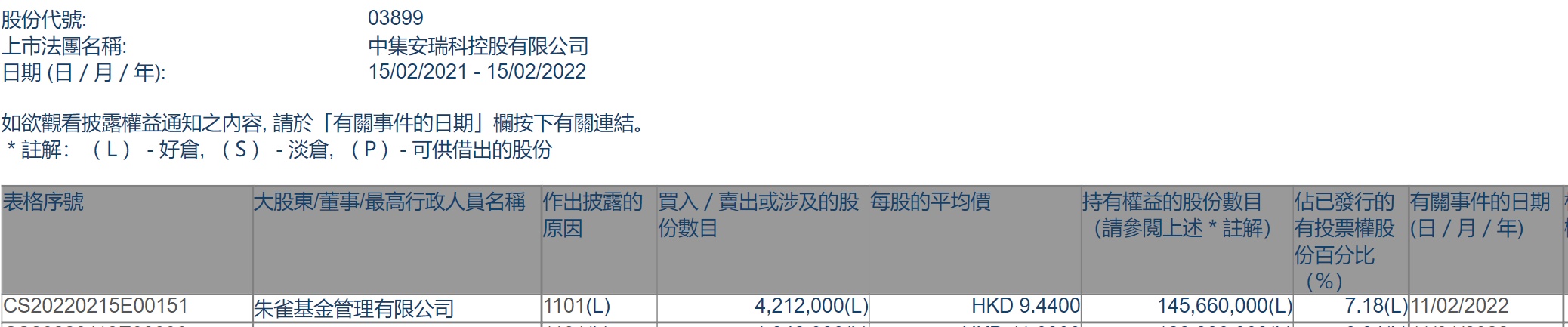 智通财经APP获悉,香港联交所最新资料显示,2月11日,朱雀基金管理有限公司增持中集安瑞科(03899)421.2万股,每股作价9.44港元,总金额约为3976.13万港元。增持后最新持股数目约为1.46亿股,最新持股比例为7.18%。