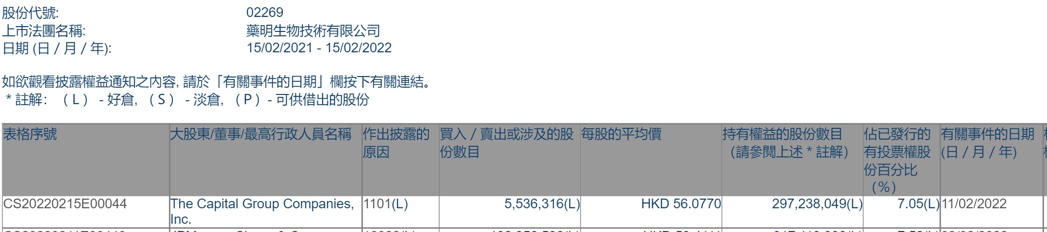 智通财经APP获悉,香港联交所最新资料显示,2月11日,The Capital Group Companies, Inc.增持药明生物(02269)553.6316万股,每股作价56.077港元,总金额约为3.1亿港元。增持后最新持股数目约为2.97亿股,最新持股比例为7.05%。