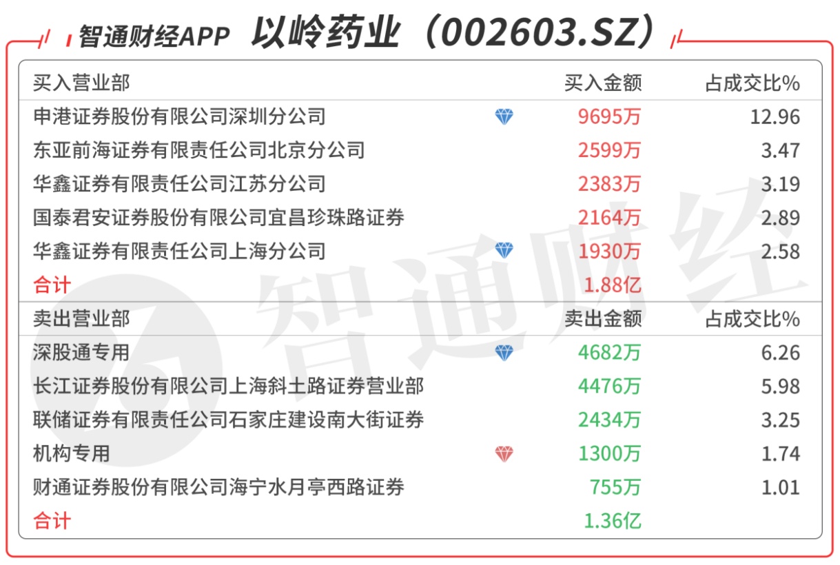 以岭药业(002603.SZ):多主力现身龙虎榜,深股通对倒,买一是知名游资的席位买入9695万元,买五是知名游资的席位买入1783万元,当日净买入6345万元,该股今日反包强势涨停,预计压力位在26附近。