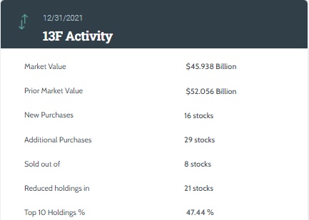 据统计,老虎环球基金第四季度持仓总市值达459.38亿美元,上一季度总市值为520.56亿美元,环比下降约12%。在第四季度的持仓组合中新增了16 只个股,增持了29只个股。同时,老虎环球还减持了21只个股并清仓了8只个股。其中前十大持仓标的占总市值的47.44%。