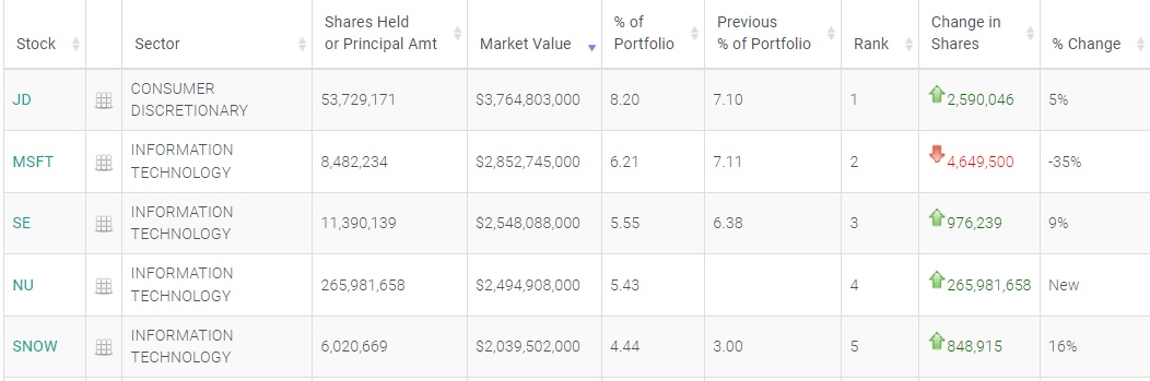 在前五大重仓股中,京东(JD.US)位列第一,持仓约5373万股,持仓市值约37.65亿美元,较上季度持仓数量上升5%,占投资组合比例为8.20%。