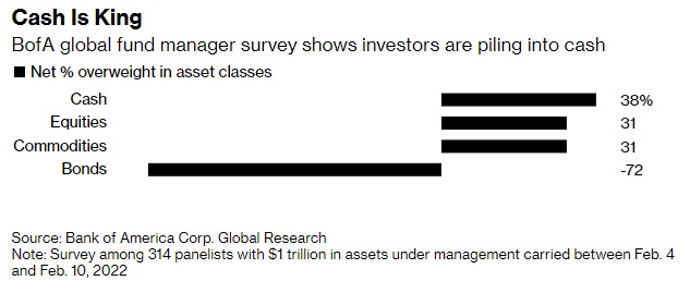 以Michael Hartnett为首的美银策略师表示,整体股票配置已大幅下降,不到三分之一的客户看好股票,低于1月份的一半以上。同时,现金被选为最受青睐的资产类别,净增持率为 38%。