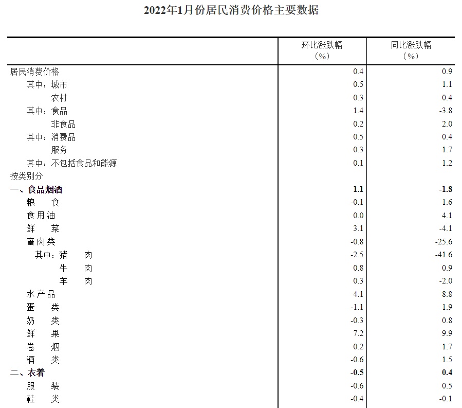 2022年1月份居民消费价格同比上涨0.9% 环比上涨0.4%