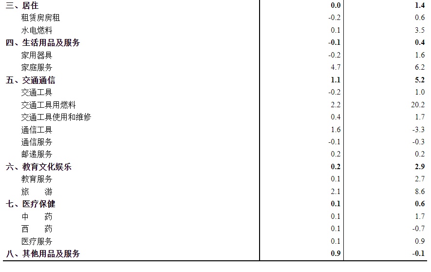 其他七大类价格同比六涨一降。其中,交通通信、教育文化娱乐、居住价格分别上涨5.2%、2.9%和1.4%,医疗保健、衣着、生活用品及服务价格分别上涨0.6%、0.4%和0.4%;其他用品及服务价格下降0.1%。