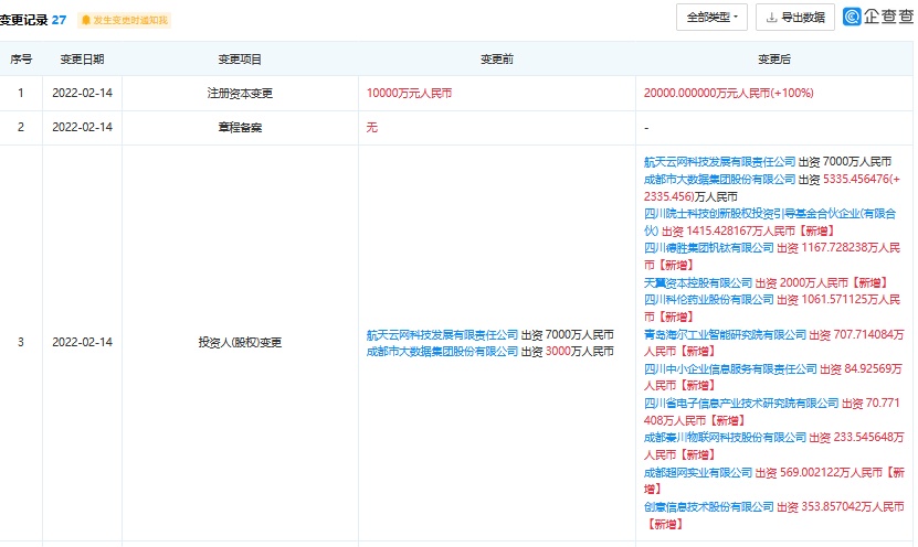 智通财经APP获悉,企查查App显示,2月14日,工业云制造(四川)创新中心有限公司发生工商变更,股东新增青岛海尔工业智能研究院有限公司、中国电信全资子公司天翼资本控股有限公司等,同时注册资本增至2亿人民币,增幅100%。