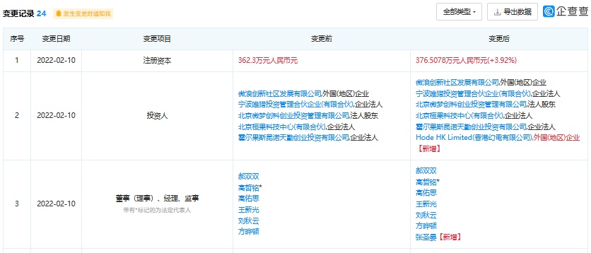 智通财经APP获悉,企查查App显示,2月10日,歪果仁研究协会关联公司北京唯喔科技有限公司发生工商变更,新增股东香港幻电有限公司,同时公司注册资本增至约376.51万人民币。据了解,香港幻电有限公司为B站关联公司。