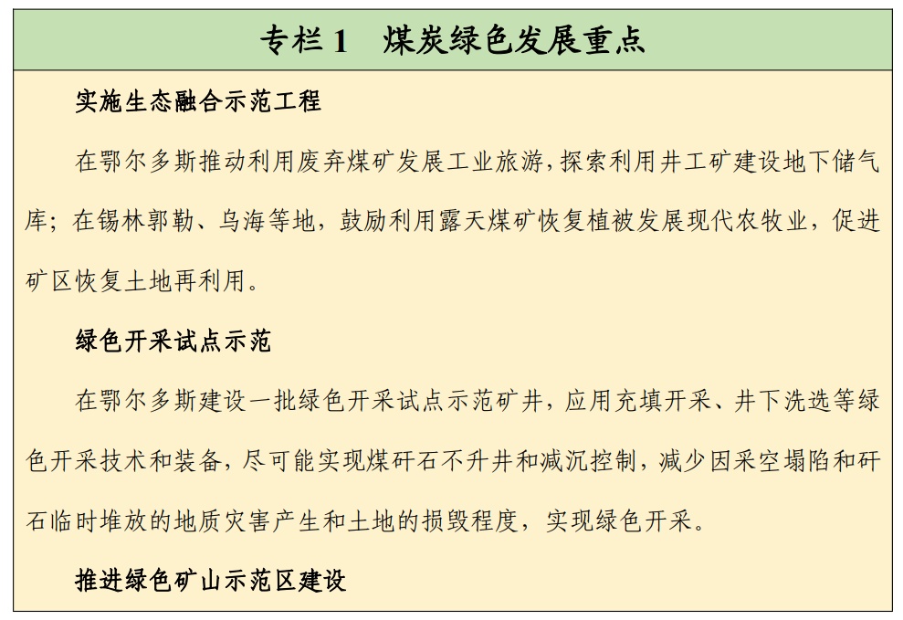 开展煤炭资源绿色开采试点示范,因地制宜推广应用充填开采、井下洗选等绿色开采技术及装备,最大限度减少煤炭资源开发对生态环境造成的影响。加强绿色矿山达标建设,新建煤矿全部按照绿色矿山标准规划、设计、建设和运营管理,生产煤矿结合实际按照绿色矿山标准加快改造升级,达到绿色矿山标准。开展煤矸石充填开采试点,推动鄂尔多斯南部地区矿井水综合利用,推广应用氢能源卡车和电动卡车,最大限度降低碳排放。鼓励煤矿企业采用先进技术回收非永久保护煤柱等边角残煤提高煤炭资源回收率。到2025 年,生产煤矿绿色矿山达标率达到 100%。