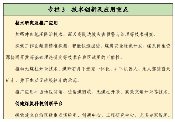完善煤炭行业科技创新体制机制建设,加强协同创新平台建设和政策引导,适时研究制定煤炭行业重大技术装备创新目录。支持政府、企业、高校、科研机构建立政产学研联盟,持续协同攻关,推进煤炭科技成果转化和应用。依托工业园区和大型煤炭企业,联合国内外院校和研究机构,探索建立自治区级重点实验室、技术创新中心、工程研究中心等创新平台。