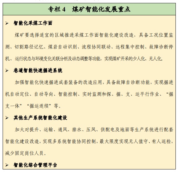 “十四五”期间,优化煤矿各大系统,实施信息化、智能化改造,提高生产效率;鼓励企业加大节能技术改造和技术创新投入,开发、推广先进节能技术和设备,选用节能推广目录中低碳节能环保设备,淘汰落后产能及高耗能工艺、装备,加强节能管理,推进千万吨级先进洗选技术装备研发应用,降低洗选过程中的能耗、介耗和污染物排放,进一步降低煤炭工业单位能耗水平。