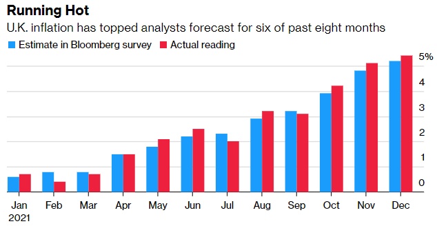 英国通胀率若连续第四次带来冲击,将足以提振市场对英国央行下个月大幅加息的预期。今天15:00将公布的数据预将显示,英国上个月通胀率保持在5.4%的30年高点,此前该国物价曾持续攀升。在英国通胀率突破英国央行2%的目标以后得八个月里,已有六次超过预期。