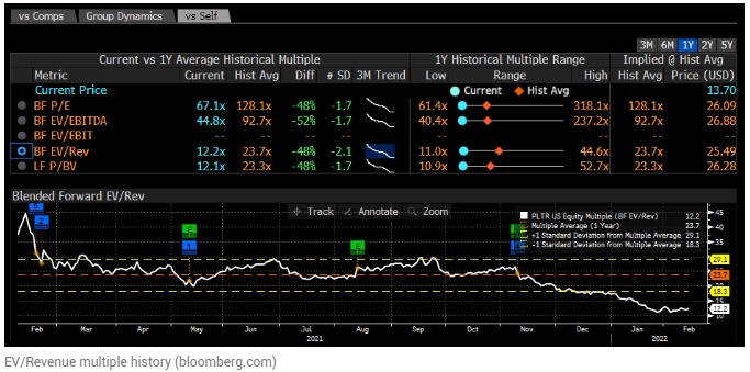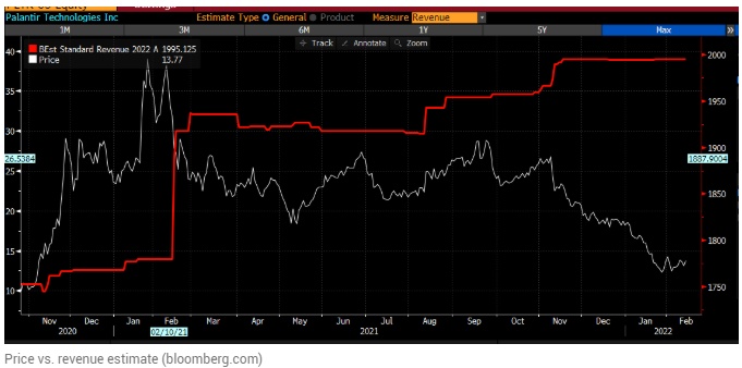 Palantir也不例外,因为该公司在根据会计准则计算的情况下还未盈利,其实际营收水平仍然较低,这导致其估值在近几个月大幅下跌。从下图可以看出,Palantir对2022年的营收预期自11月中旬(红线)以来一直持平,接近20亿美元,而其股价却从每股25美元左右下降到目前的不到15美元。