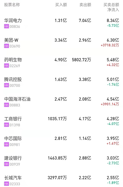 此外,中海油(00883)、中国神华(01088)、美团-W(03690)分别获净买入1.98亿、1.4亿、1.27亿港元。而工商银行(01398)、建设银行(00939)、华润啤酒(00291)分别遭净卖出4.07亿、2.73亿、1.38亿港元。