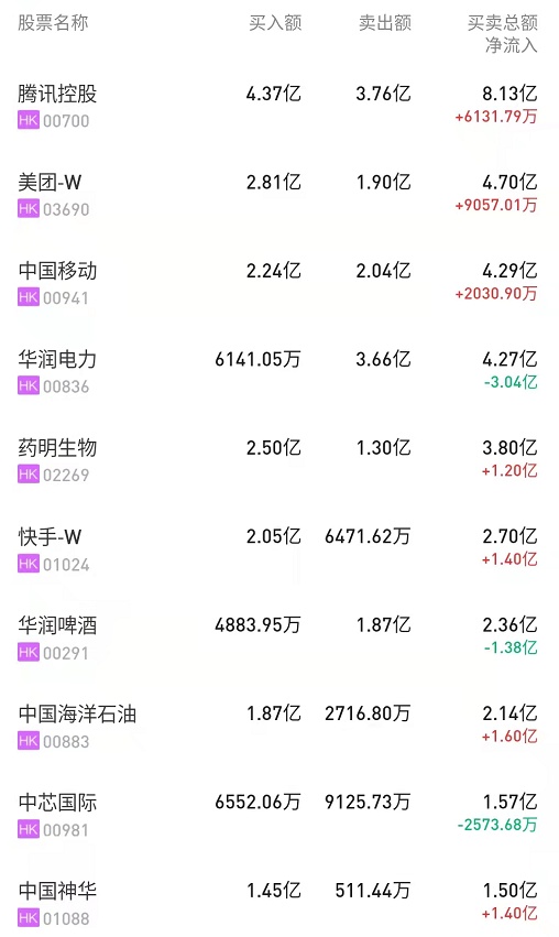 中国移动(00941)获净买入3320万港元。消息面上,小摩发布研究报告称,中资电信股于今年开局强劲,相信是由于市场风向轮动至防御性价值股,以及中移动的H股回购计划,引发投资者对中资电信股宣布更多有利于股东政策的猜测。在稳健的行业背景下,该行对中资电信板块保持正面。