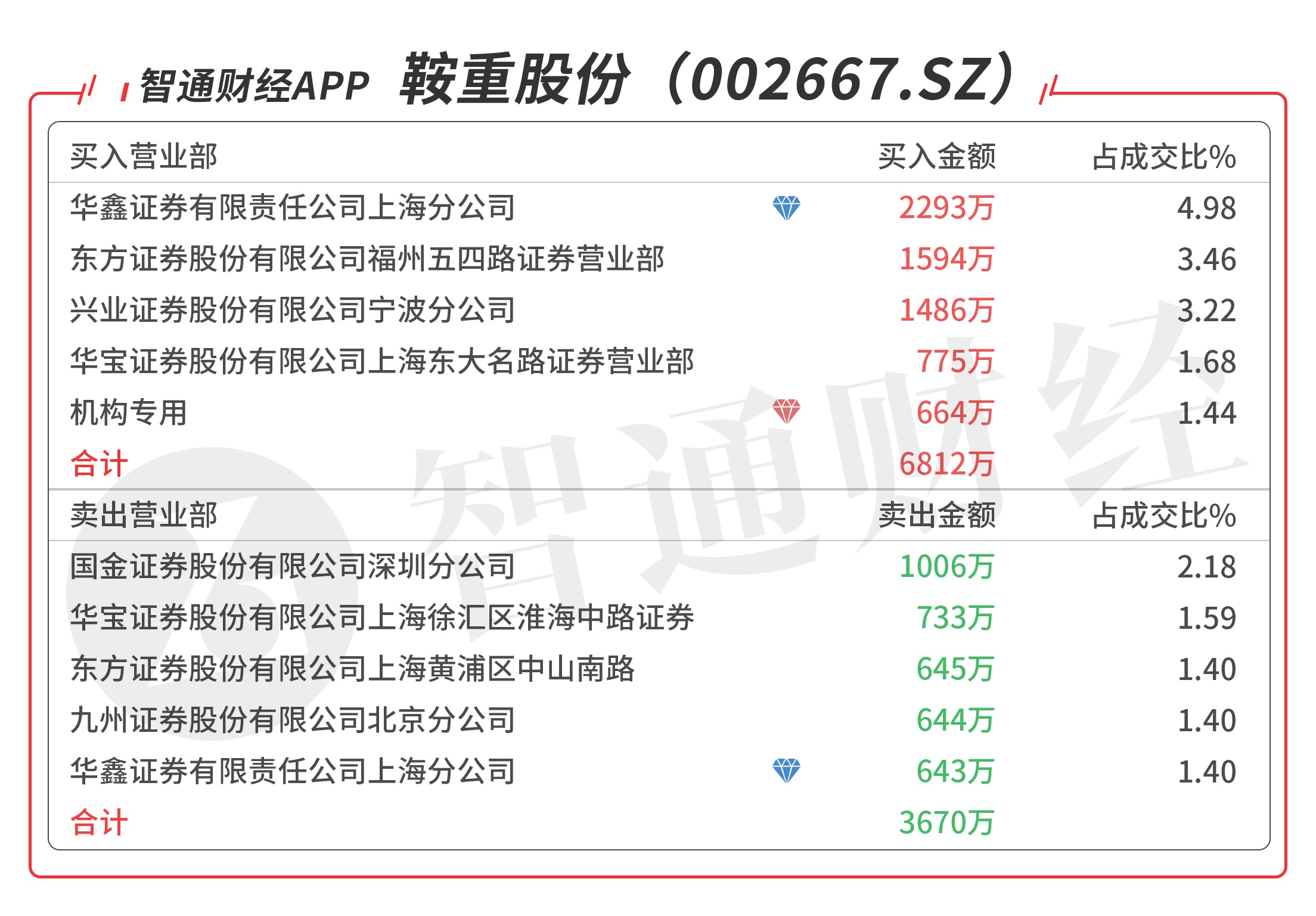 鞍重股份(002667.SZ):多主力现身龙虎榜,机构对倒当日买卖均衡,买一是知名游资的席位,对倒净买入1651万元,当日净买入3623万元,该股底部三连板,预计压力位在年线附近。