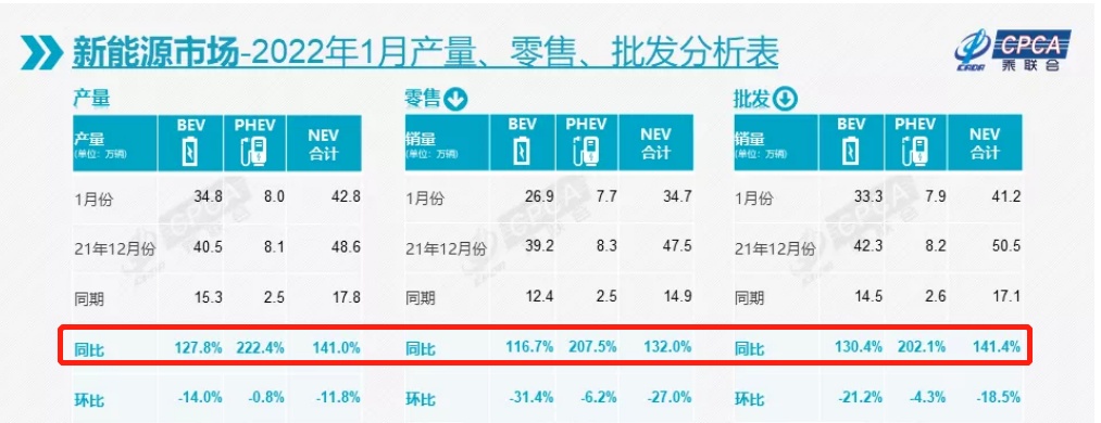 从渗透率来看,新能源乘用车的批发渗透率更是高达19.0%,较2021年1月8.4%的渗透率提升10多个百分点。而零售渗透率为16.6%,较2021年同期亦提升10个百分点。