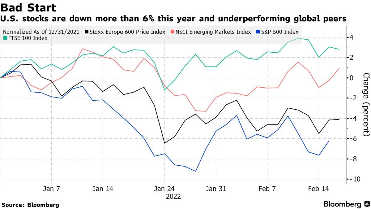 这些趋势反映了今年股票市场轮换,从数据上来看,今年标普500指数的表现逊于MSCI All-Country World这一全球指数,此前标普500指数在2021年强劲上涨,连续创下历史新高。由于投资者目前预计美联储将加大力度收紧货币政策,以遏制通胀飙升,估值较高且以科技股为主的美国股市承受的压力尤其大。