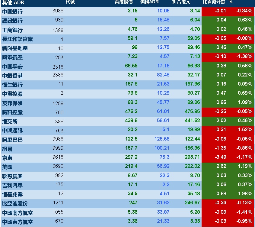 智通财经APP获悉,周三美股三大指数涨跌不一,港股ADR指数上涨,按比例计算,收报24785点,较香港收市涨66.84点,幅度为0.27%。