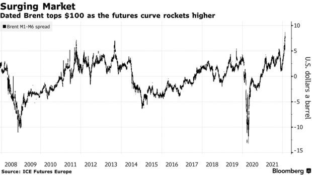 Platts)的数据显示,北海布伦特原油期货合约周三达到100.80美元/桶,为2014年以来的首次。而期货市场的现货溢价表明,目前正处于有史以来供应最紧张的原油市场之一。