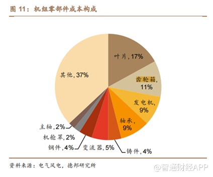 从风机成本占比来看,叶片、齿轮箱,发电机和轴承成本占比比较大。其中轴承(偏航、变桨和主轴承)成本占比约为9%。