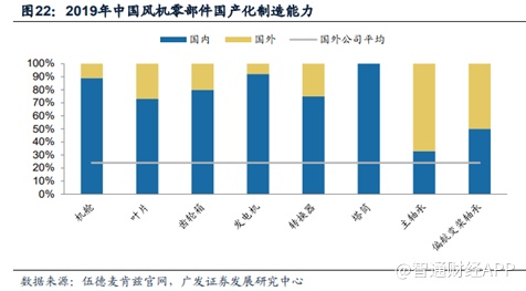 根据伍德麦肯兹官网的数据,2019年我国机舱、发电机、塔筒的国产化程度已经非常高,均达到80%以上的水平,叶片、齿轮箱、转换器等零部件国产化率也已经达到了70%以上,而主轴轴承、偏航变桨轴承的国产化率分别只有33%和50%。