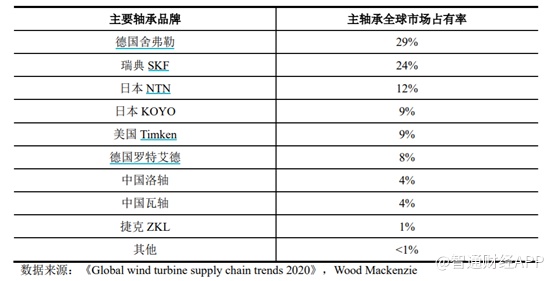 从全球范围看,轴承行业经过多年产业竞争后,高端市场被瑞典SKF、德国Schaeffler、日本NSK、日本JTEKT、日本NTN、日本NMB、日本NACHI、美国TIMKEN这四个国家八家大型跨国轴承企业所垄断,而目前,我国主要占据轴承行业的中低端市场。根据电气风电招股说明书,2020年舍弗勒、SKF、NTN的全球市占率分别为29%、24%和12%,三家加总达到65%。而我国本土企业洛轴、瓦轴的市占率只有各4%,新强联在2021年才开始放量。