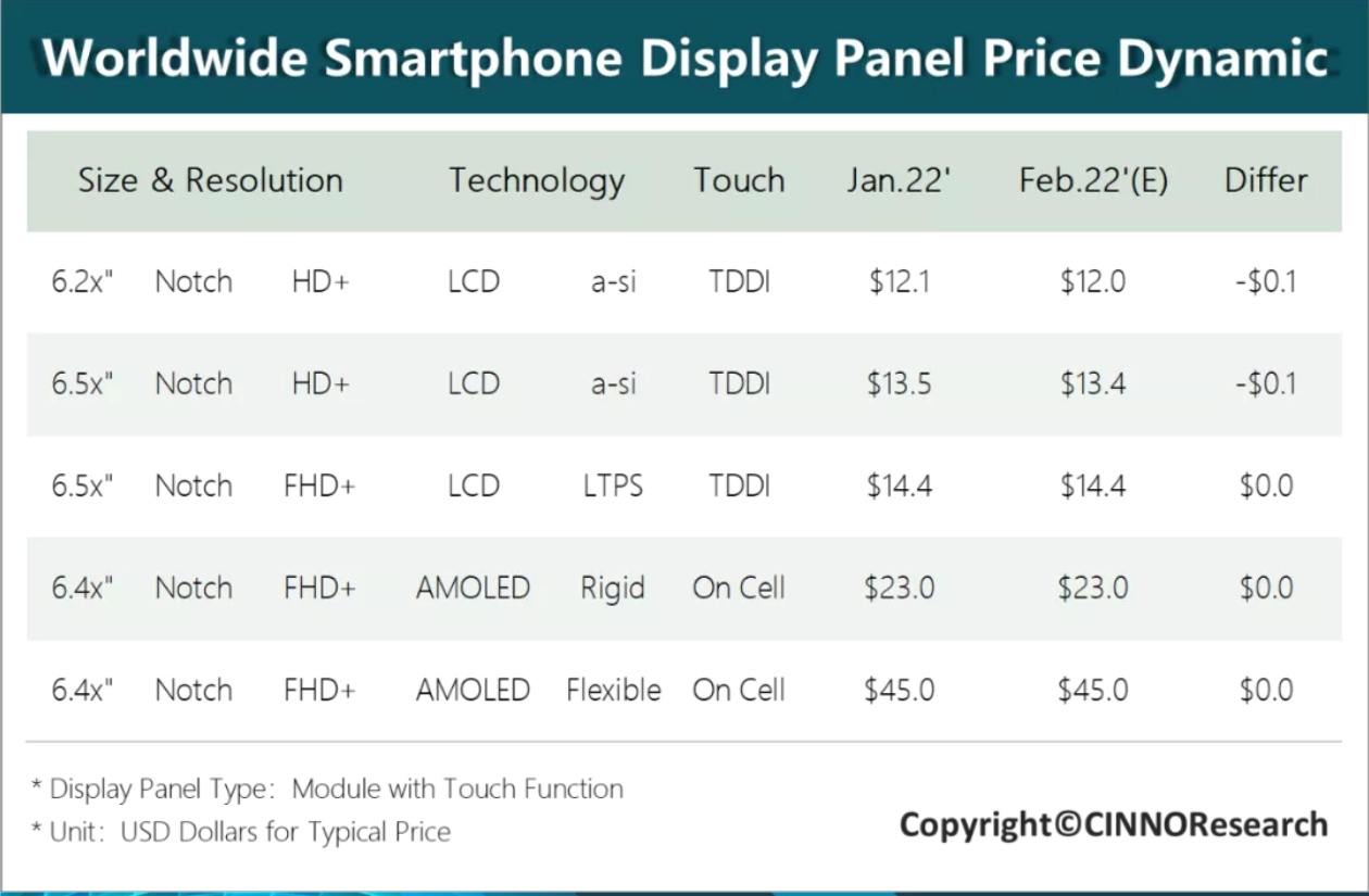 刚性AMOLED面板主力厂商三星显示(SDC)的国内品牌需求开始呈现下滑趋势,主要源于其主力品牌客户OPPO/vivo在去年Q4囤积了部分刚性AMOLED面板,造成本季度需求受到影响;另一方面,因刚性AMOLED面板与LTPS面板价差持续扩大,手机品牌在产品规划上也有部分从刚性AMOLED转向LTPS;CINNO Research预估2022年2月和3月AMOLED面板价格受芯片持续紧缺影响将继续维持高位;a-Si产品价格将会继续小幅下降0.1美金,LTPS价格将维持稳定。