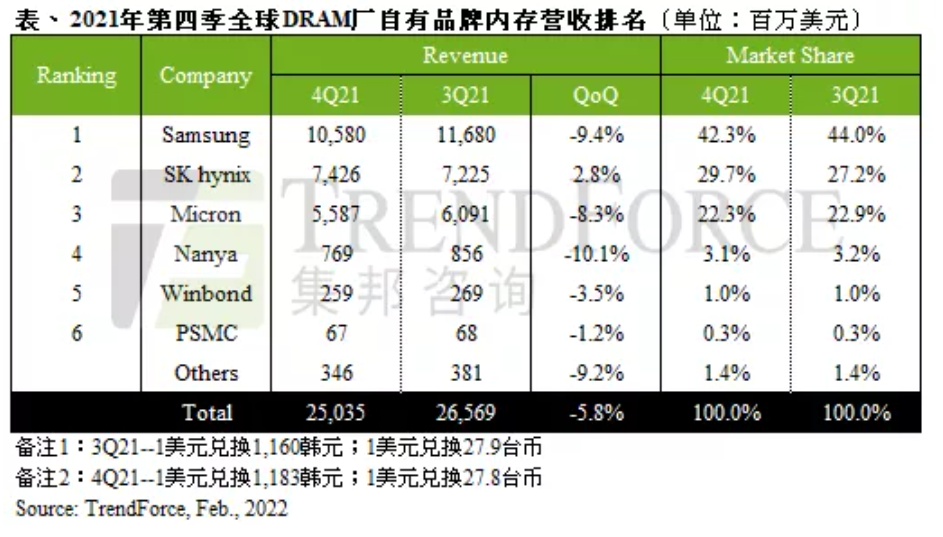 OEMs业者态度最为明显。因此,多数DRAM原厂在2021年第四季出货量皆呈现衰退,拉货动能下降也导致DRAM报价反转向下。2021年第四季DRAM总产值季减5.8%,来到250.3亿美元,仅少数供应商如SK海力士(SK