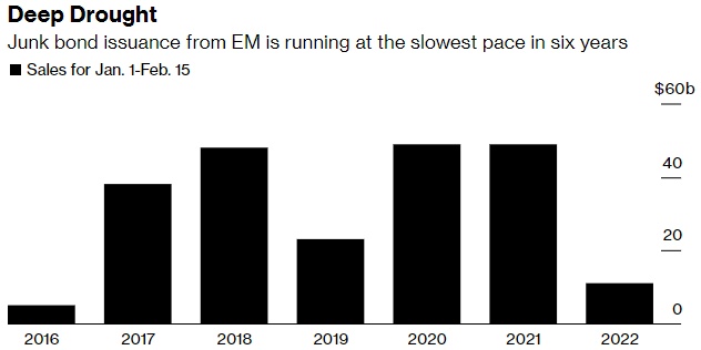 因为在多年流动性充裕之后,交易员急于消化更为激进的政策收紧,新兴市场债券(尤其是高收益债券)的销售量受到影响。但由于有近1万亿美元的欧元和美元计价的新兴市场债券将在2023年底或更早之前被偿还,债券发行人可能别无选择,只能在今年晚些时候进入市场,并支付更高的价格。