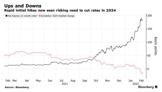据了解,美联储主席鲍威尔曾承诺将在不引发经济衰退的前提下,控制40年来最严重的通货膨胀。债券交易员认为,控制成本压力将需要迅速收紧政策,预计今年将加息六次或更多,这很有可能会导致经济严重放缓。与此同时,收益率曲线已经达到疫情以来最平坦水平,利率交易员认为,美联储极有可能在2024年再次降息。