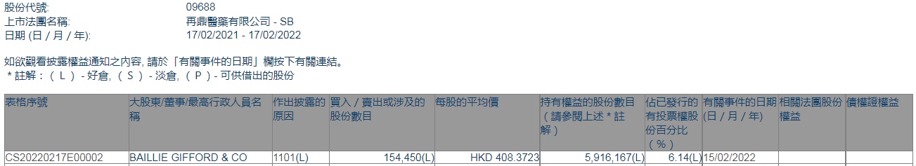 智通财经APP获悉,香港联交所最新资料显示,2月15日,BAILLIE GIFFORD&CO增持再鼎医药-SB(09688)15.445万股,每股作价408.3723港元,总金额约为6307.31万港元。增持后最新持股数目约为591.62万股,最新持股比例为6.14%。