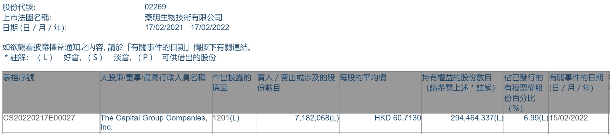 智通财经APP获悉,香港联交所最新资料显示,2月15日,美国资本集团减持药明生物(02269)718.2068万股,每股作价60.713港元,总金额约为4.36亿港元。减持后最新持股数目约为2.94亿股,最新持股比例为6.99%。