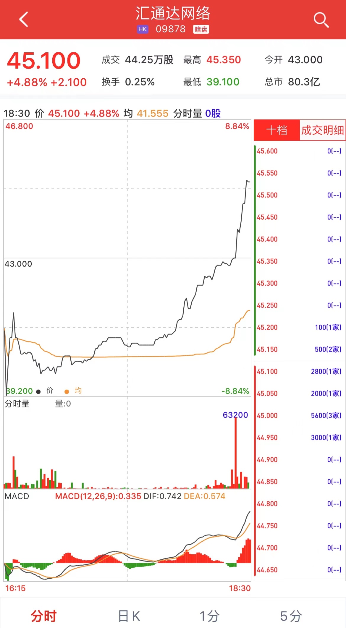智通财经APP获悉,汇通达网络(09878)将于2月18日(星期五)在香港挂牌。截至收盘,利弗莫尔证券暗盘交易显示报价45.1港元,较招股价43港元涨4.88%。每手100股,不计手续费,每手赚210港元。