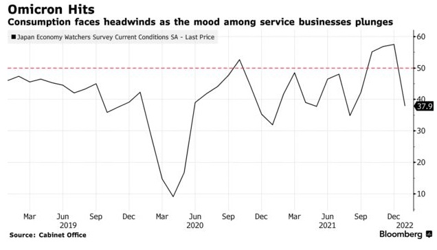 与年初的约 500 例相比,日本目前每日感染人数激增,这降低了消费者的情绪,1 月份面向客户的企业的情绪因此而暴跌。