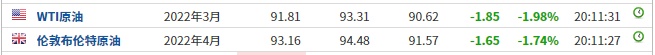 3. 截至发稿,WTI原油跌1.98%,报91.81美元/桶。布伦特原油跌1.74%,报93.16美元/桶。