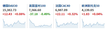 2. 截至发稿,德国DAX指数涨0.08%,英国富时100指数跌0.49%,法国CAC40指数涨0.32%,欧洲斯托克50指数涨0.04%。