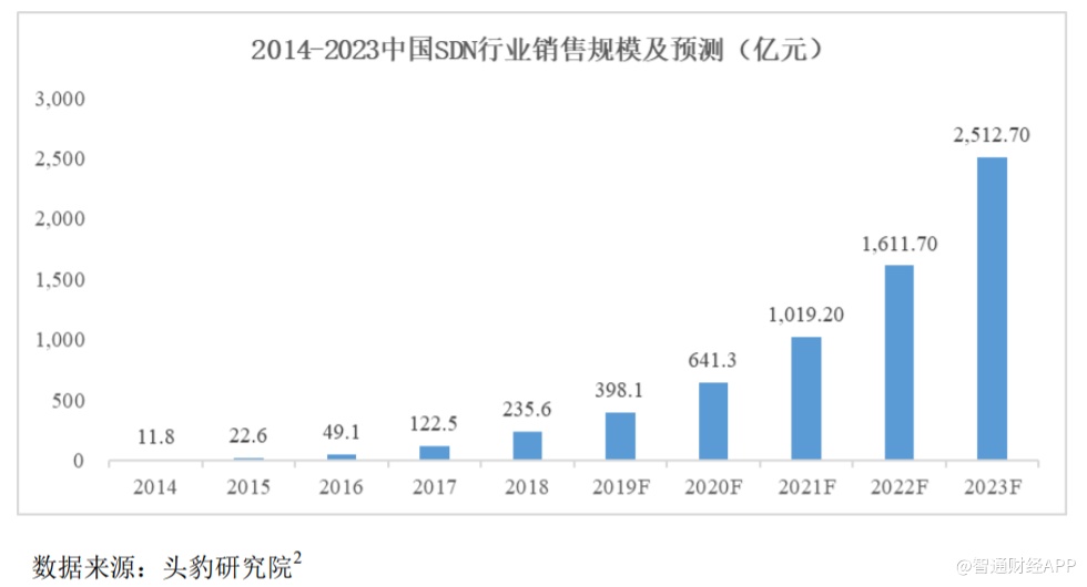 其认为,随着SDN关键技术的不断发展使得SDN产品日益完善与成熟,且在云计算应用在各行业中的不断渗透,SDN行业未来将持续高速发展。其预计,至2023年,中国SDN行业销售规模有望突破2500亿元,2019年至2023年期间的年均复合增长率将达58.5%。