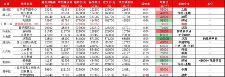 据悉北京本次共推出18宗地块,总出让面积为83.16万平米,总起拍价491.8亿元。主要分布在大兴区、城市副中心通州、顺义区、丰台区以及朝阳区,怀柔区、石景山区、昌平区、房山区也有少量地块出让。其中,17宗地顺利成交,1宗石景山830地块再次流拍。共计出让建设用地面积80.1万㎡,合计规划建筑面积169.8万㎡,成交总价480.225亿元。