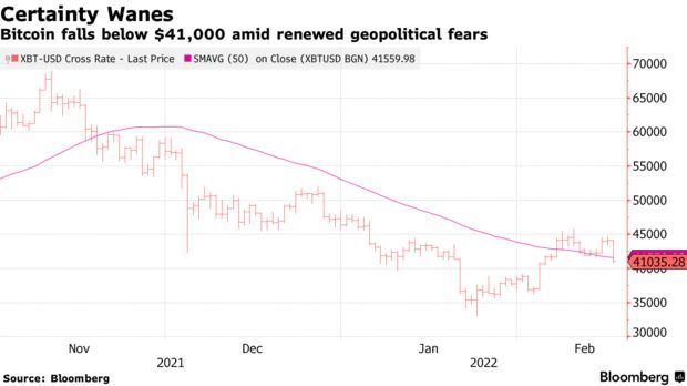 智通财经APP获悉,对俄乌局势持续紧张的担忧情绪再度笼罩包括风险资产在内的全球市场,比特币跌至4.1万美元以下,接近其50天移动均线。