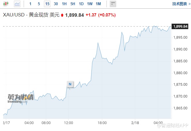 截至发稿,现货黄金为每盎司1899.84美元,此前曾触及6月11日以来的最高点1900.99美元。COMEX 4月黄金期货收涨1.6%,报1902美元/盎司。