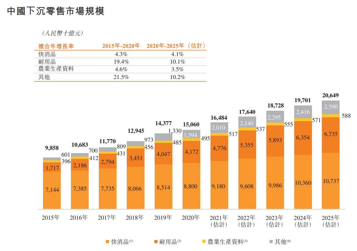 根据弗若斯特沙利文的报告,下沉市场中的耐用品和农业生产资料(包括家用电器、消费电子产品、家居建材和农业生产资料),从2015年平均家庭支出的3500元人民币,增长至2020年的6700元人民币,复合年增长率达到13.9%;预计2025年将持续增长至10700元人民币,预计复合年增长率将达到9.8%。