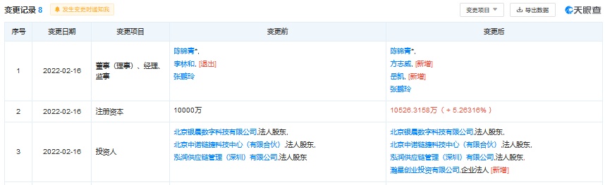 智通财经APP获悉,天眼查APP显示,北京中诺链捷数字科技有限公司日前发生工商变更,注册资本增至10526.3158万元,新增小米关联公司瀚星创业投资有限公司为股东,持股5%。
