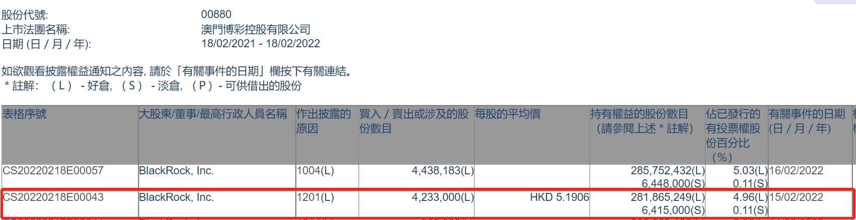 智通财经APP获悉,香港联交所最新资料显示,2月15日,贝莱德减持澳博控股(00880)423.3万股,每股作价5.1906港元,总金额约为2197.18万港元。减持后最新持股数目约为2.82亿股,最新持股比例为4.96%。