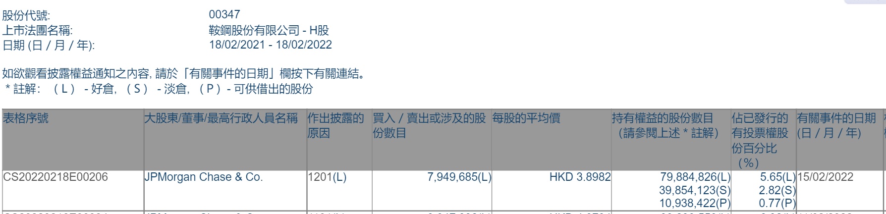智通财经APP获悉,香港联交所最新资料显示,2月15日,小摩减持鞍钢股份(00347)794.9685万股,每股作价3.8982港元,总金额约为3098.95万港元。减持后最新持股数目约为7988.48万股,最新持股比例为5.65%。
