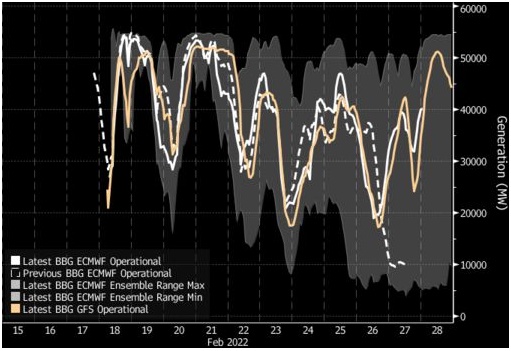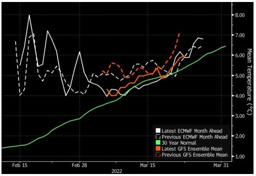 另外,今年没有出现寒流也有助于压低价格。德国国家气象局Deutscher Wetterdianst周五表示,今年迄今为止,德国天气相对温和,下个月可能会转冷。相关天气模型预测,到3月份,气温将逐渐接近季节性标准。