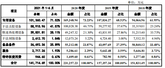 报告期内,公司干法去胶设备销量分别为49台、85台、148台和84台,其销售收入也由2018年的3.53亿元增至2020年的10.80亿元,整体销售规模较大且增速较快,2020年市场份额已跃居全球第一。而公司快速热处理设备收入分别为5.12亿元、4.38亿元、4.92亿元和3.98亿元,虽然最近三年收入占比有所下滑,但2018年至2020年公司市场份额亦稳居全球第二。此外,干法刻蚀设备处于市场开拓阶段,设备销售台数较少,收入占比相对较低。