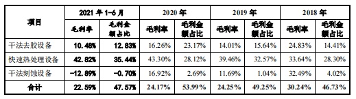 于报告期内,公司主营业务毛利率分别为40.09%、33.75%、32.79%及33.96%,与同业相比,自2019年调整业务策略以来,公司毛利率已持续低于行业均值。其中,专用设备毛利率呈持续下滑趋势,分别为30.24%、24.25%、24.17%和22.59%。而收入占比持续提升的干法去胶设备的毛利率自2019年以来毛利率大幅下滑,于报告期内分别为24.83%、14.01%、16.26%及10.48%。