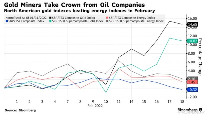 智通财经APP获悉,今年年初至今,油气及天然气板块一直是美股中表现最好的两个板块,但由于东欧紧张的地缘政治和北美的通货膨胀风险,黄金板块目前有望在本月成为股市中表现最好的板块。