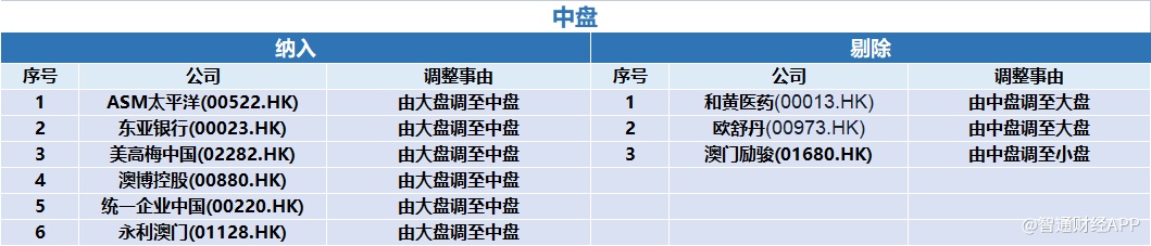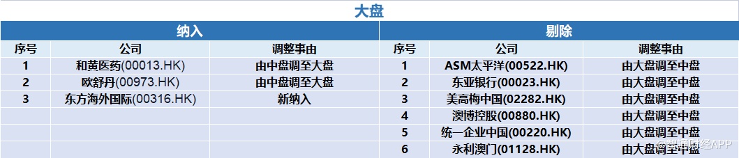 中盘股此次共纳入6只港股,包括ASM太平洋(00522)、东亚银行(00023)等,都是因市值变化由大盘调至中盘;和黄医药(00013)等3只港股被剔除。