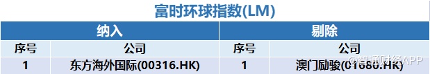 总体来看,富时环球指数(LM)此次纳入东方海外国际(00316),剔除澳门励骏(01680)。